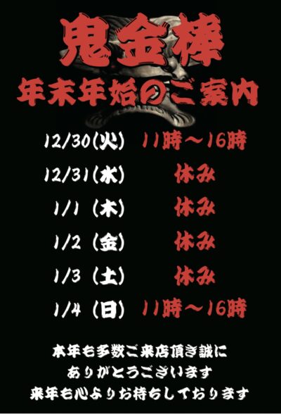 カラシビ味噌らー麺 鬼金棒 年末年始 営業時間のご案内